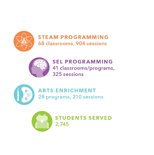 One of our greatest achievements this year was the broadening of our intensive delivery model. We partnered with 8 classrooms, expanding to include a classroom of students with developmental disabilities. Each classroom partnered with our artist-educators for 45 sessions of arts integrated learning. Extensive feedback and evaluation showed that students found joy in learning, increased their engagement, and made measurable academic gains.